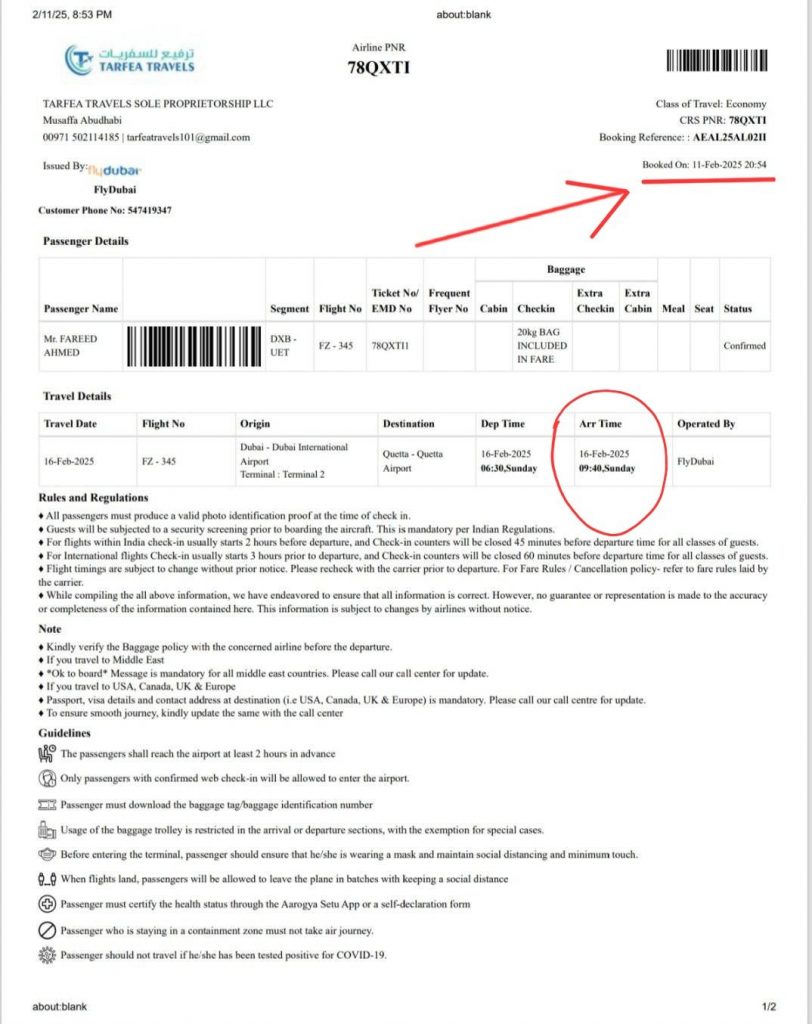 According to his family, Fareed had been working in the United Arab Emirates for several years. They said his UAE residency permit was valid until 9 March 2025, and that he returned to Pakistan ahead of its expiry, landing at Quetta Airport on 16 February.