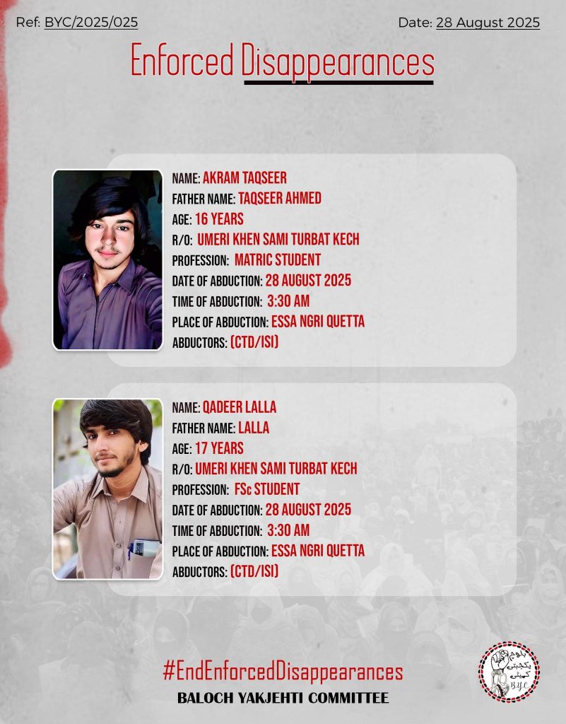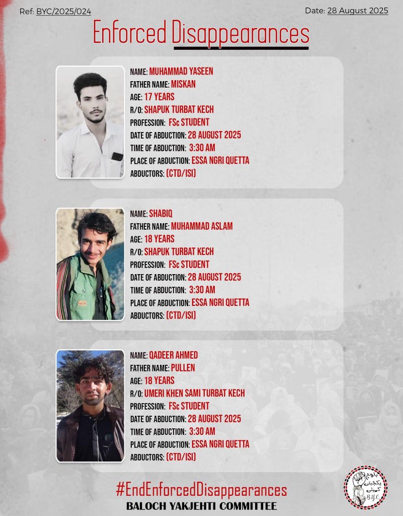 The Baloch Yakjehti Committee (BYC) confirmed the incident in a statement, condemning the disappearances and stressing that all those taken are students. The group demanded their immediate release.