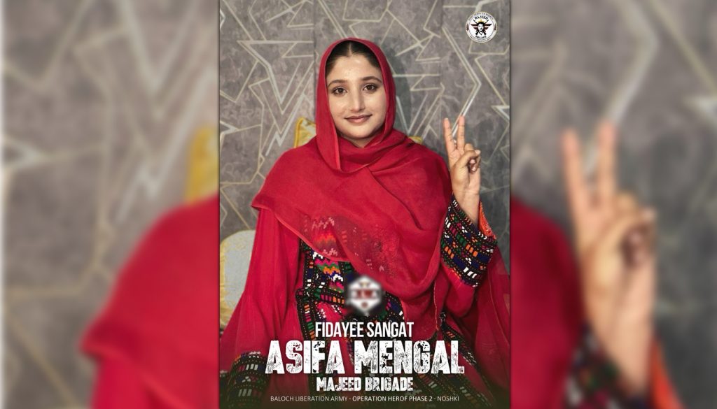 The second fighter was identified as 23-year-old Asifa Mengal, from Killi Qazi Abad in Nushki. The group said she joined the Majeed Brigade on 2 October 2023, took her “fidayee decision” in January 2024 and carried out a vehicle-borne explosive attack targeting the ISI headquarters in Noshki on 31 January.
